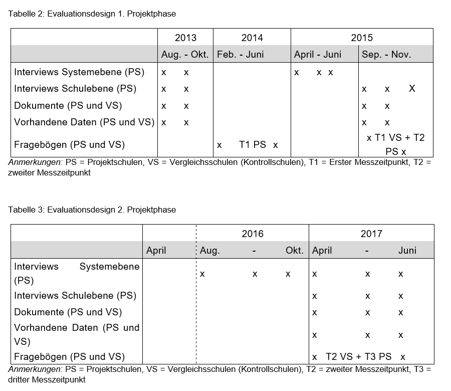 Die methodischen Phasen und Teilschritte bauen aufeinander auf. Die Evaluation bedient sich also unterschiedlicher Datenerhebungs- (und analyse-)verfahren. Die folgenden Abbildungen illustrieren das Vorgehen: